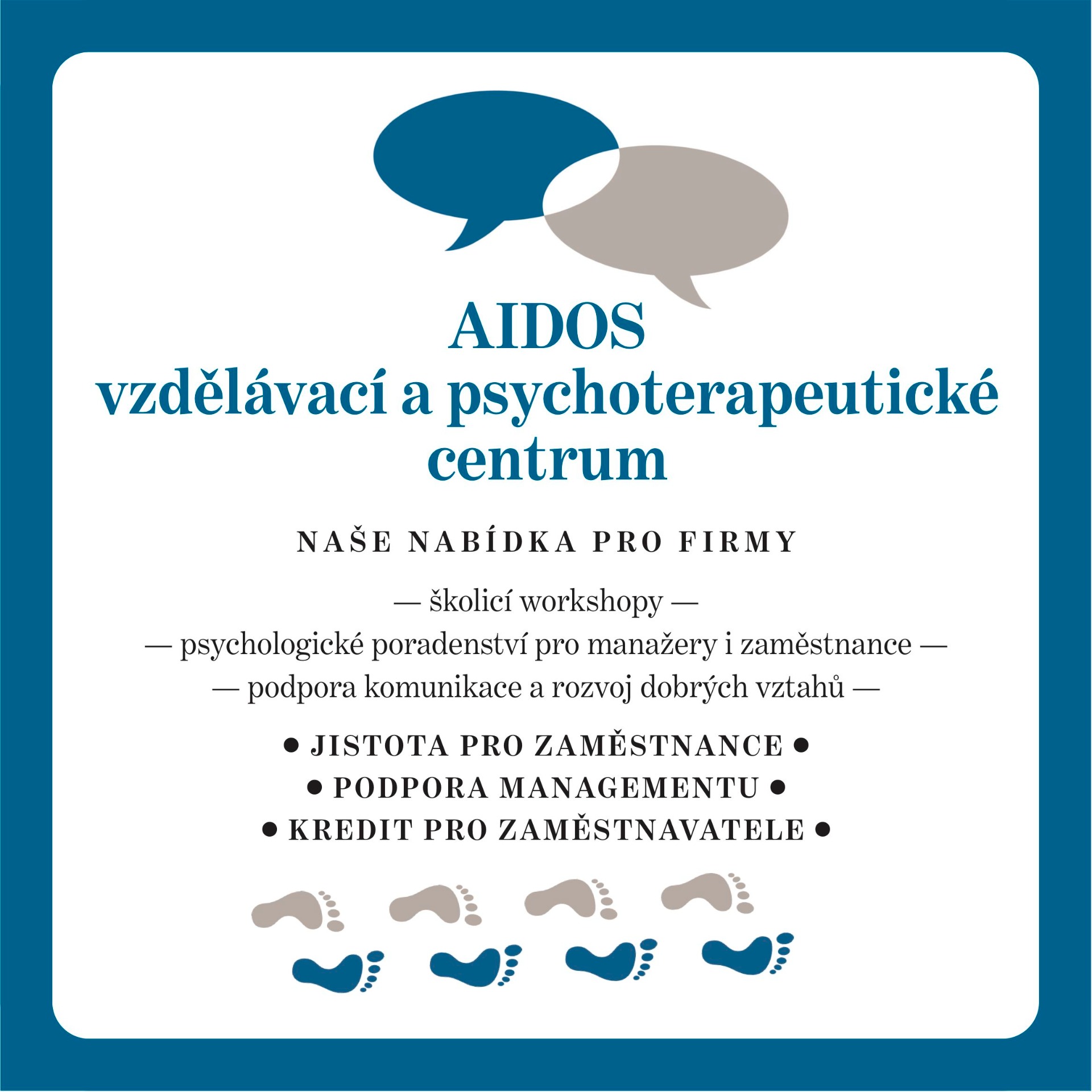 - Nabízíme firmám školící semináře a workshopy a psychologické poradenství pro manažery i zaměstnance a podporu komunikace a rozvoj dobrých vztahů.